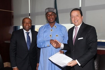 Photo: Minister Chibuike Rotimi Amaechi receives the letter appointing him to the UNITAR Board of Trustees. He is joined in the photo by Dr. Larry Boms and Mr. Alex Mejia.
