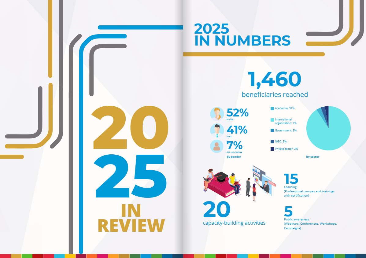 The year's outcomes tell a clear story of growth. Of the 1,460 beneficiaries reached, 52% were female and 41% male, with 7% choosing not to disclose. An overwhelming 91% came from academia, reflecting the Centre's deep integration with the higher education ecosystem, while government agencies (3%), NGOs (3%), and the private sector (2%) rounded out the participant profile. The Centre delivered 15 learning activities, professional courses and trainings with certification alongside 5 public awareness events including webinars, conferences, workshops, and campaigns.