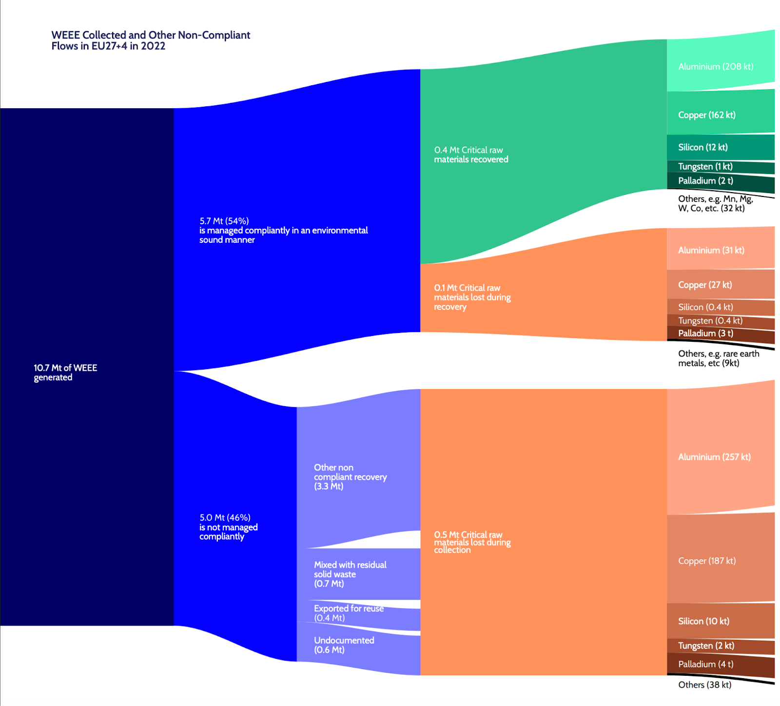 These materials, such as copper, aluminium, palladium and rare earth elements, are essential for Europe’s renewable energy technologies and digital infrastructure. In 2022, the region generated 10.7 million tonnes of e‑waste, or about 20 kilograms per person. Just over half (54 per cent) was managed compliantly, with the remainder handled through informal or unregulated routes. From compliant treatment, approximately 400,000 tonnes of CRMs were recovered, but significant losses still occurred due to inefficiencies in design and collection systems.