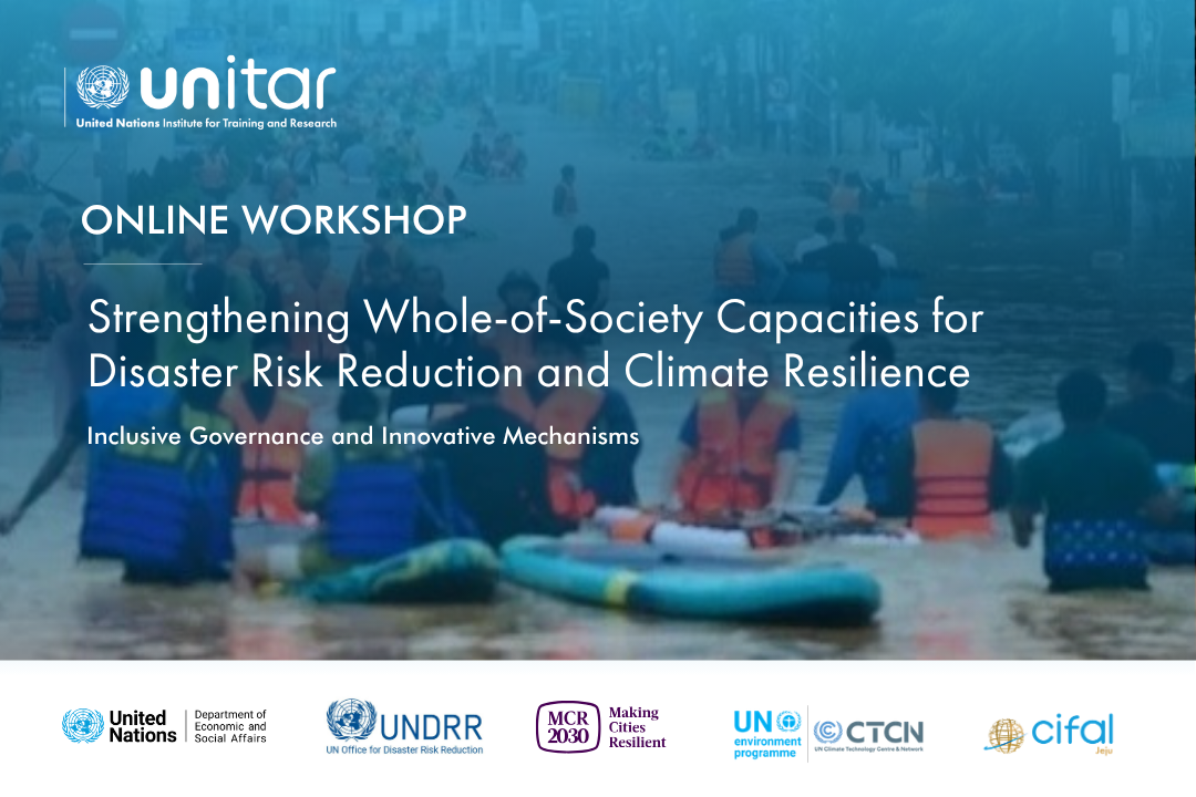 8 April 2026, Incheon, Republic of Korea – UNITAR and its International Training Centre for Authorities and Leaders (CIFAL) Jeju are pleased to collaborate with the United Nations Office for Disaster Risk Reduction Northeast Asia Office and Global Education and Training Institute (ONEA-GETI), the United Nations Department of Economic and Social Affairs (UN DESA) Division for Public Institutions and Digital Government (DPIDG), the United Nations Project Office on Governance (UNPOG), and the United Nations Environment Programme (UNEP) Climate Technology Centre and Network (CTCN) to offer a three-day virtual training workshop titled “Strengthening Whole-of-Society Capacities for Disaster Risk Reduction (DRR) and Climate Resilience: Inclusive Governance and Innovative Mechanisms”