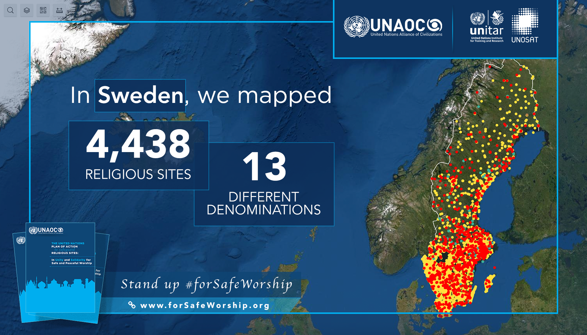 New York, USA & Geneva, Switzerland, 07 July 2022 – The United Nations Alliance of Civilizations (UNAOC) and the United Nations Satellite Centre (UNOSAT) unveiled a new interactive map of religious sites in Sweden. The map is available online for public consumption through this URL: https://forsafeworship.org/sweden/