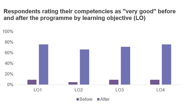 Figure 2 illustrates that the proportion of respondents who rated their knowledge, skills and competencies as “very good” increased substantially for each learning objective (LO), reflecting strengthened confidence and perceived mastery.