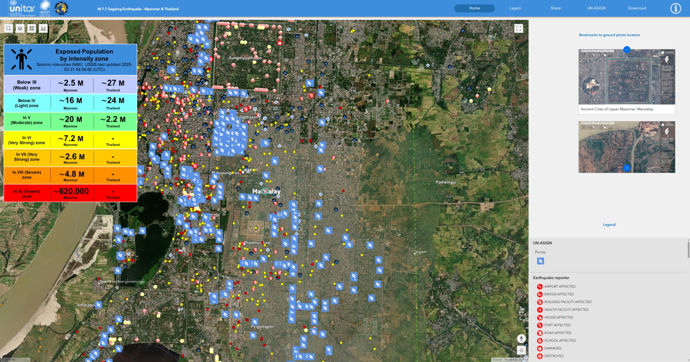 The Myanmar earthquake response illustrated a combined satellite imagery and ground-based damage assessment methodology through the integration of UNOSAT's UN-ASIGN crowd-sourcing application with satellite imagery analysis. This combined approach significantly enhances both the accuracy and completeness of damage assessments.