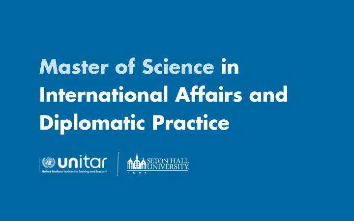 UNITAR has partnered with Seton Hall University’s School of Diplomacy and International Relations to offer an Online Master of Science in International Affairs and Diplomatic Practice.