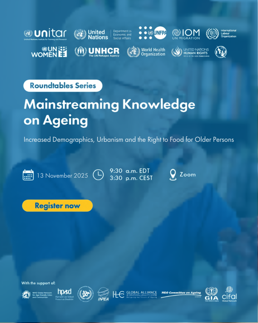 In the framework of the 4th year of the Virtual Roundtable Series 'Mainstreaming Knowledge on Ageing,' we warmly invite you to join the fifth event, 'Increased Demographics, Urbanism, and the Right to Food for Older Persons'. This learning initiative will aim to raise awareness about the impact of urbanisation on food security for older persons and to promote sustainable policies that ensure access to nutritious food for them in all settings.