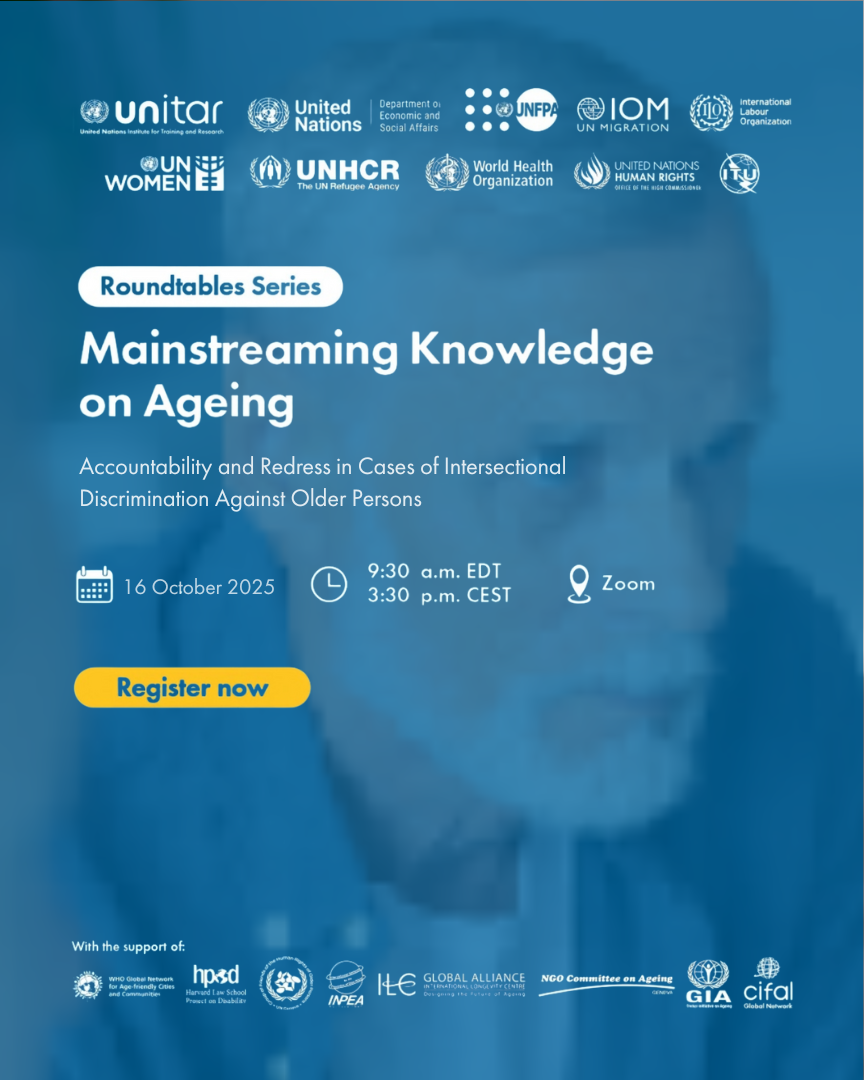 In the framework of the 4th year of the Virtual Roundtable Series 'Mainstreaming Knowledge on Ageing,' we warmly invite you to join the fourth event, 'Accountability and Redress in Cases of Intersectional Discrimination Against Older Persons'. This learning initiative will explore the challenges older persons face in seeking justice and advocates for stronger legal frameworks and mechanisms that address discrimination based on multiple, overlapping identities.